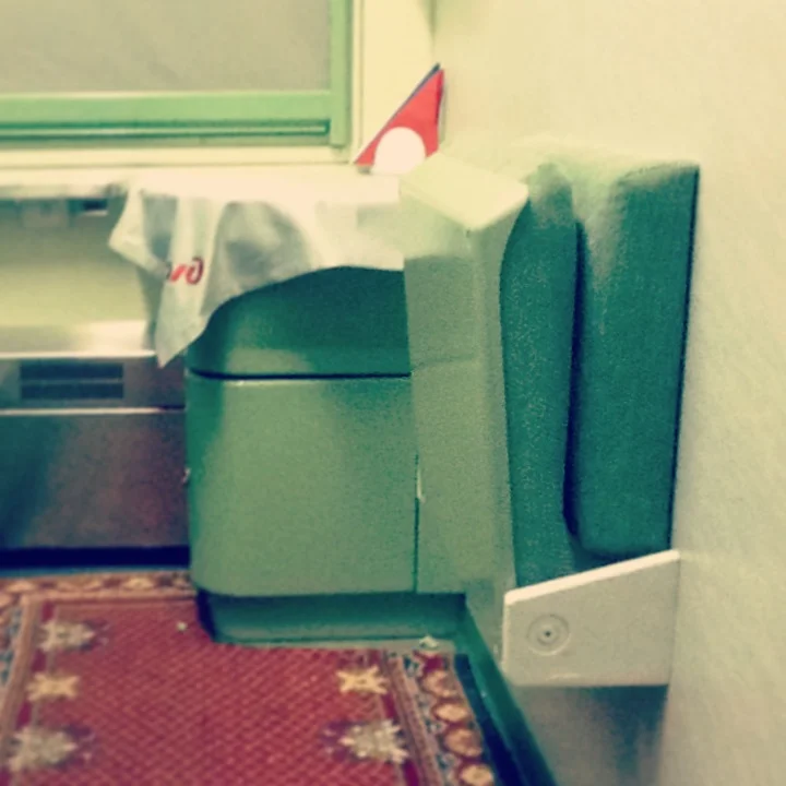 Есть одноместное сидение на противоположной стене. Для того, чтобы поесть за столом, не мешая пассажиру на нижней полке, его вполне достаточно. Я на этом сидении даже провела два часа за чтением — всё прошло неплохо. Впрочем, у меня была интересная книга, и мне быстро удалось абстрагироваться от бытовых деталей окружающей реальности.